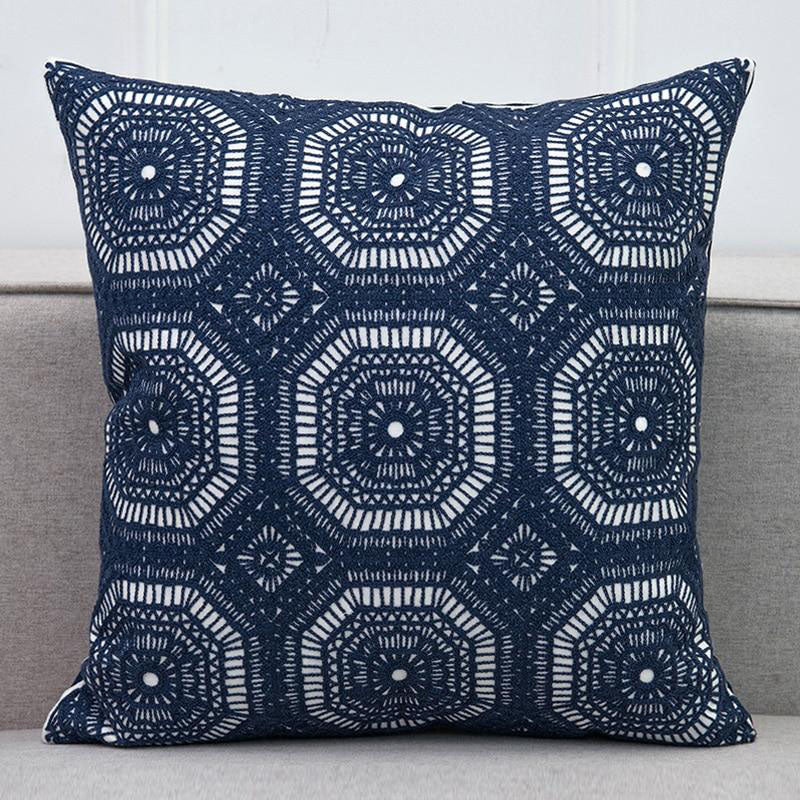 - High quality cushion covers with geometric crochet style embroidery on cotton canvas