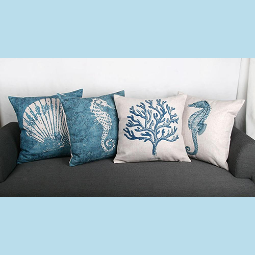 Cream Linen Cotton Cushion Covers With Blue Coral and Seahorse Prints