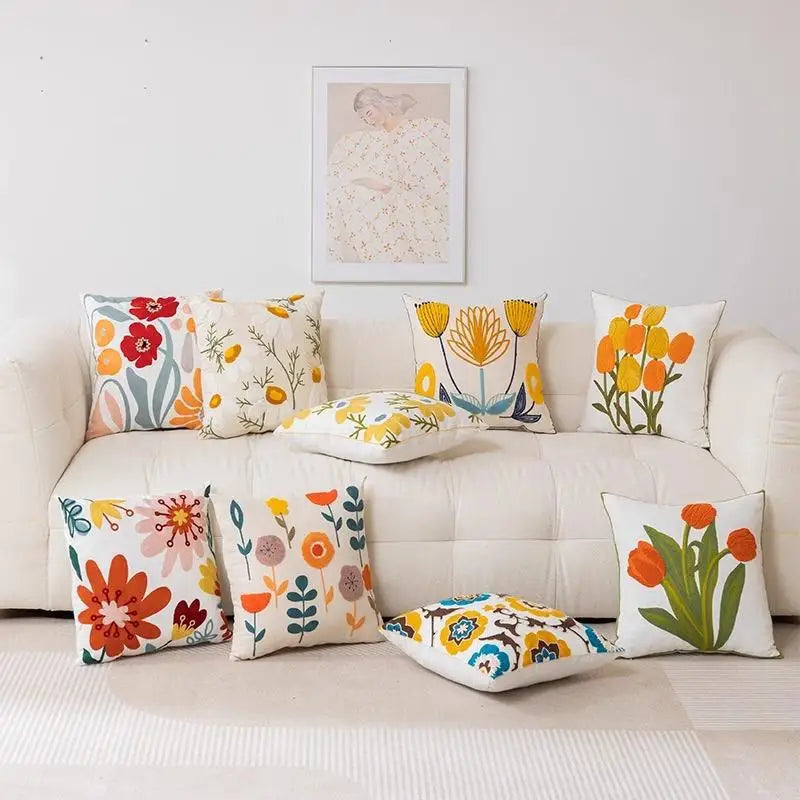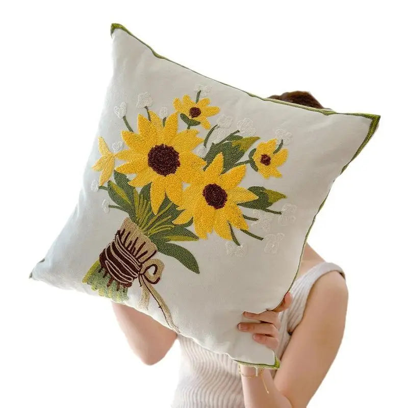Embroidered and tufted cushion covers with florals (sunflowers, daffodils, tulips and more) on off-white fabric. All cushion covers are 18in x 18in or 45cm x 45cm. High-quality cushion covers suitable for the sofa in the living room, bedroom, hall or dining room. Bring some stylish decor into your home. Cool and modern high quality Scandinavian design cushion covers